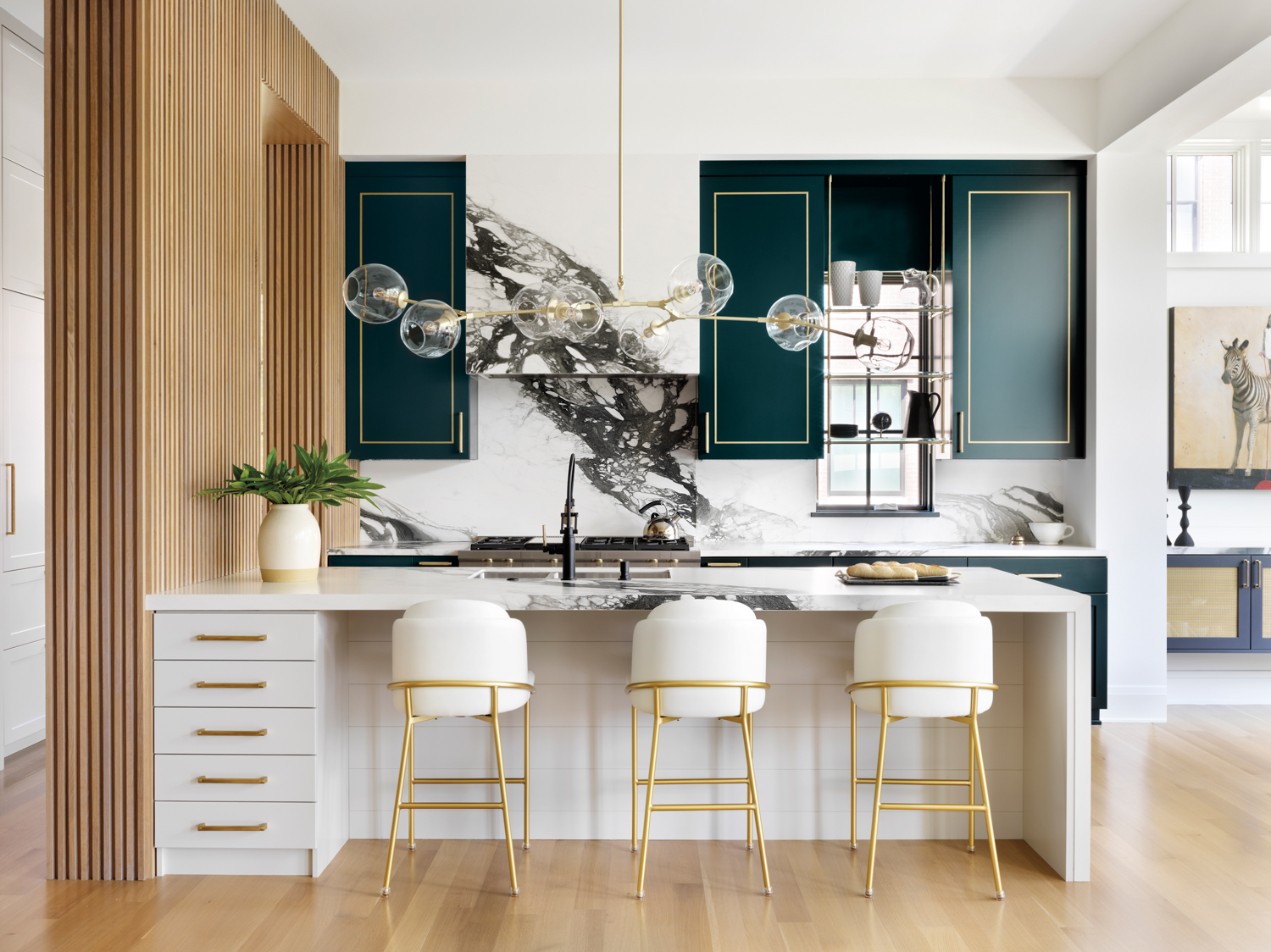 The kitchen remains the heart of the home, and bold design choices are making waves. Deep jewel tones like emerald green or navy blue are complemented by gold or brass hardware for a rich, sophisticated look. Open shelving, large kitchen islands, and smart appliances are also in demand.
